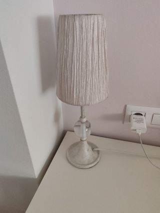 Preciosa lámpara de dormitorio de estilo moderno. Ideal para añadir un toque elegante a cualquier espacio. - Pantalla de tela con textura plisada. - Base de metal y cristal con acabado desgastado, aportando un toque vintage. 2 lamparitas a juego con la lámpara central para mesita de noche o escritorio.