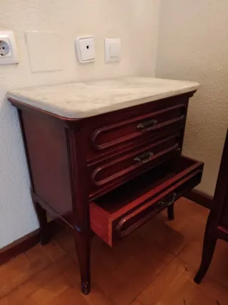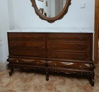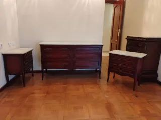 Elegante conjunto de dormitorio clásico, ideal para una habitación matrimonial. Incluye un armario de gran capacidad, una mesita de noche con detalles en mármol y una cómoda igual con su espejo. Estos muebles son de madera color caoba oscura y presentan muy buen estado. - Armario grande de 8 puertas con molduras y tiradores de estilo clásico. 2,45 ancho y 1,89 alto. Fondo: 54 cm - Mesita de noche con tres cajones y encimera de mármol .Alto 59 cm +60 ancho. Fondo: 32 cm Comoda: fondo 42cm,alto 76cm y ancho 116 Mesa redonda:diámetro 75 cm y 43 alto - Patas torneadas en ambos muebles.