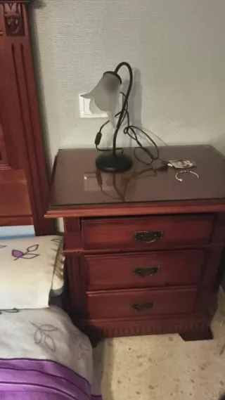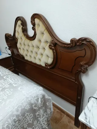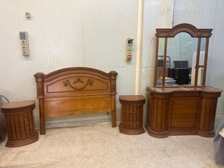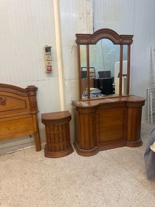 Cabecero, 2 mesitas, cómoda, espejo, galán y cuadro. El cabecero tiene un pequeño arañazo como se puede ver en la foto. Por lo demás, está en un estado casi perfecto.