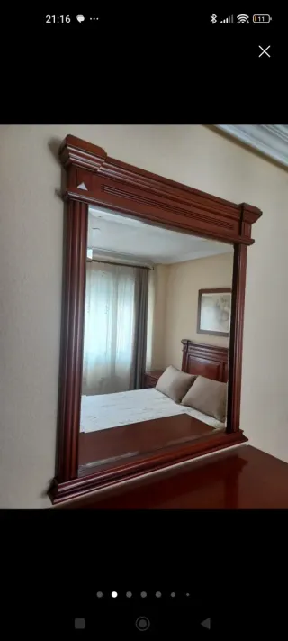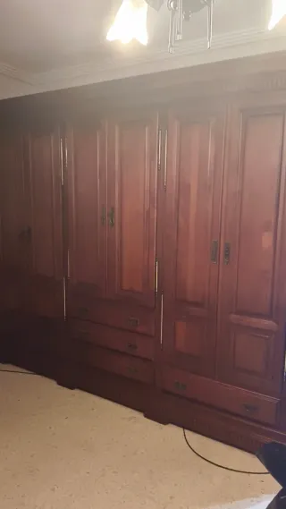 Conjunto de muebles de dormitorio en madera de cerezo. - Armario de seis puertas con espejos centrales. - Mesitas de noche. - Cómoda con cajones. - Diseño clásico con detalles ornamentales. Esta en Jaén capital y habría que recogerlo.