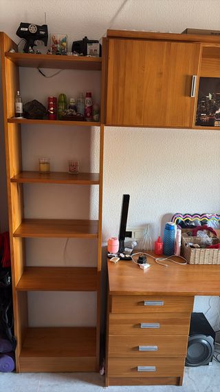 Conjunto de muebles para dormitorio juvenil en madera de Roble. - Estantería con varias baldas. - Escritorio con cajones. - Armario superior.