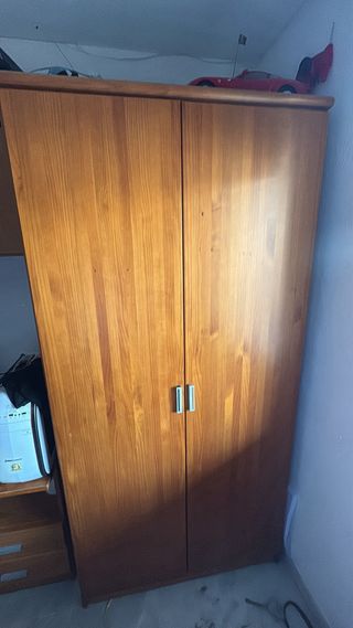 Conjunto de muebles para dormitorio juvenil en madera de pino. Están en buen estado y son ideales para una habitación infantil o juvenil. - Incluye un armario ropero alto, una estantería y una cómoda con cinco cajones. - Los muebles son de color madera natural. - Perfectos para organizar la ropa y los objetos personales.