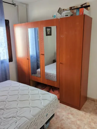 Muebles de dormitorio para matrimonio. - Armario grande de madera con cuatro puertas y espejos. Le faltan los dos cajones. - Cómoda de madera con cajones. - 2 mesitas de noche - Cabecero grande A recoger en zona Avenida de Granada en Jaén