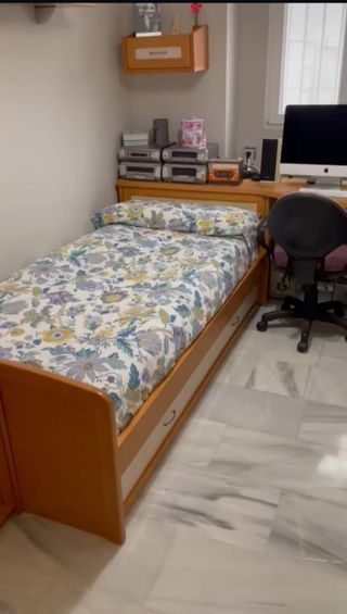 Dormitorio completo en perfecto estado. Incluye: - Escritorio de 1’67X50 ( la parte larga tiene de profundidad desde la pared 1m y la esquina 58cm) -Cama 1’05 con cama auxiliar (la estructura mide exactamente 1’13 y 2,03 de largo) -Mesita con 3 cajones de 48X45X47 -Armario de 2’35X86X57 -Cajonera con 3 cajones + puerta y baldas en el interior de 90X67X47 Cualquier pregunta, no dudes en hablarme 😊