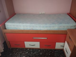 Se vende dormitorio juvenil en buen estado. Incluye cama con cajones y mesita de noche. - Cama con base de madera y colchón. - Cajones de gran capacidad. - Mesita de noche a juego con dos cajones.