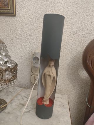 Preciosa lampara vintage con figura de la Virgen Maria. Ideal para añadir un toque de estilo retro a tu hogar. - Diseño único y elegante. - Perfecta para dormitorio o sala de estar. - En buen estado de conservación. También se puede colgar en pared para colocar en cualquier estancia. El tubo gris donde está colocada la virgen es de hierro gris .