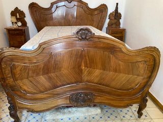 Conjunto de dormitorio antiguo con un diseño clásico. - Cama de madera con detalles tallados. - Mesita de noche a juego. - Armario - Cómoda con espejo A recoger en Peñaranda