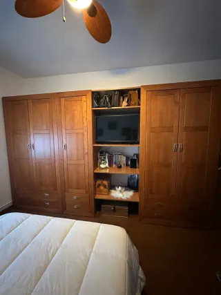 Conjunto de muebles de madera para dormitorio principal. Incluye armarios y estanterías. - Acabado en madera de cerezo. - Diseño clásico y funcional. - Incluye cabecero, mesitas , cómoda y armario.