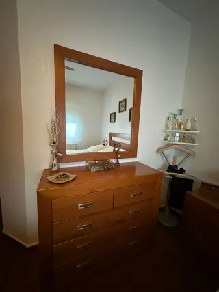 Conjunto de dormitorio de madera en perfecto estado, casi sin uso. - Cabecero de madera con diseño curvo. -Cama de matrimonio(1,35). - Mesitas de noche a juego. - Cómoda con varios cajones. - Espejo grande con marco de madera.