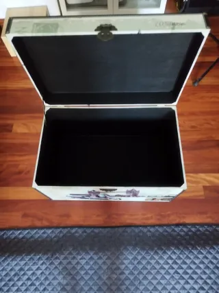 Baúl decorativo con un diseño vintage y elegante. Ideal para almacenar objetos o como pieza de decoración. - Acabado exterior con estampado. - Interior forrado en tela negra. - Cierre metálico frontal.