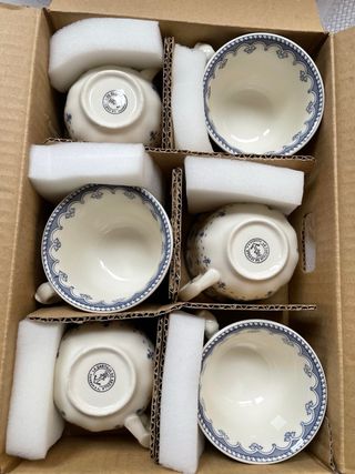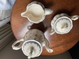 Preciosa vajilla de loza inglesa original de la mítica marca Churchill (Made in England). Se vende juego de más de 60 piezas con el icónico diseño campestre en azul y blanco. Es una pieza atemporal, perfecta tanto para uso diario como para ocasiones especiales o decoración estilo rústico/vintage. -Sopera -24 Platos llanos -12 Platos hondos -12 Platos postre -6 Bandejas -Salsera con su bandeja -Juego de café tazas+platillos -Cafetera + lechera+azucarero -Fabricada en Inglaterra. Venta en persona