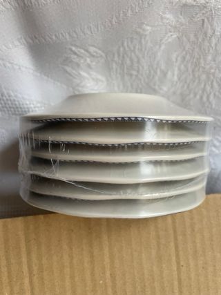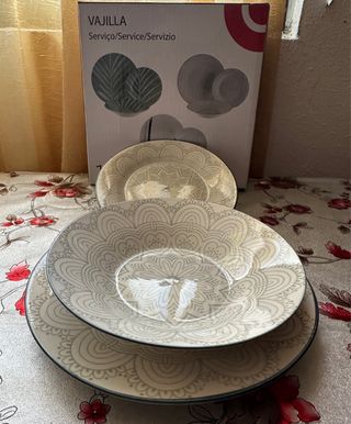 Vajilla nueva a estrenar, en su caja original. Diseño moderno color gris blanco ideal para dar un toque diferente a la mesa. Incluye 4 platos llanos de 27 cm, 4 platos hondos de 23 cm y 4 platos de postre de 19 cm. Apto para lavavajillas y microndas