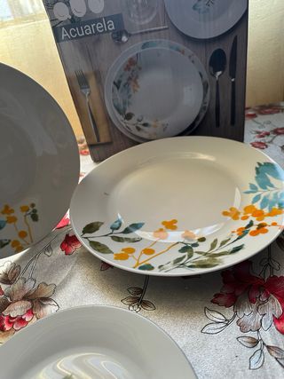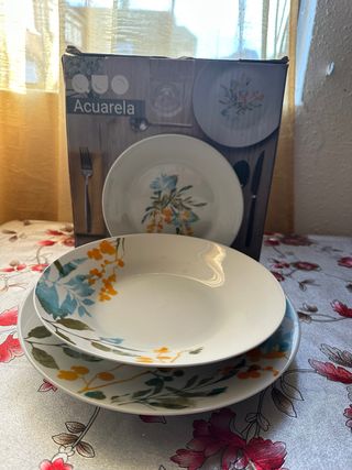 Vajilla nueva a estrenar, en su caja original. Diseño moderno tipo acuarela, ideal para dar un toque diferente a la mesa. Incluye 4 platos llanos de 27 cm, 4 platos hondos de 23 cm y 4 platos de postre de 19 cm. Apta para lavavajillas y microondas. Material resistente y fácil de limpiar. Tengo más unidades disponibles y también en otros colores, consultar sin compromiso. Entrega en mano o envío.