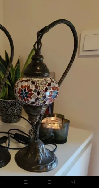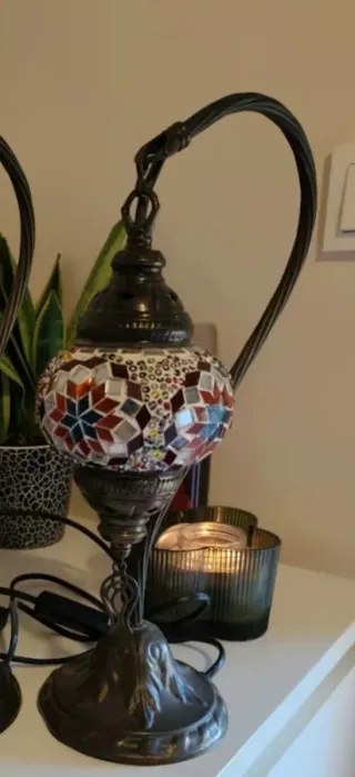 Elegante lámpara de estilo marroquí con un diseño artesanal. - Pantalla de vidrio con mosaicos de colores. - Base y estructura de metal. - Acabado en tonos plateados y multicolores.