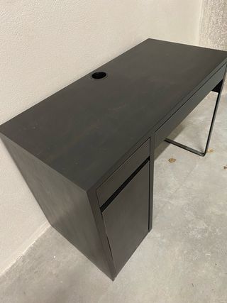 Elegante escritorio con un diseño moderno y funcional. - Superficie de madera. - Patas de metal. - Acabado en color negro.