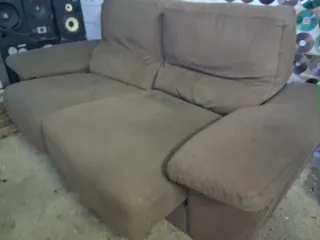 Sofá de dos plazas en buen estado. Su diseño combina tonos azules y marrones, aportando un toque moderno a cualquier espacio. - Tapicería de tela y cuero. - Estructura robusta.