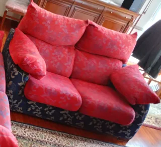 Sofá de dos plazas con un tacto suave y agradable. Lo podemos desmontar y se puede transportar si se quiere a bilbao por un poco mas - Tapicería de terciopelo. - Color azul intenso. - Diseño elegante con patas de madera.