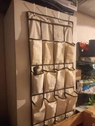 Organizador colgante para puerta, ideal para maximizar el espacio. - Diseño con múltiples compartimentos. - Acabado en beige con ribetes marrones.