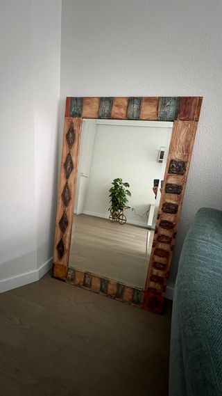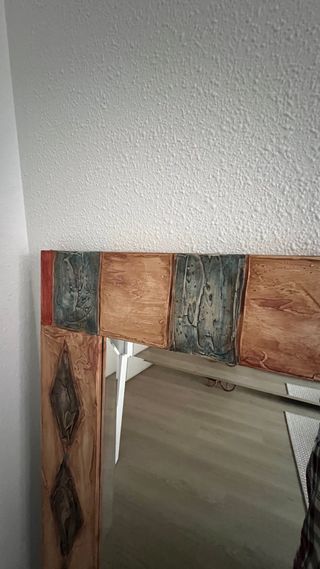 Este espejo tiene un marco de madera con un diseño único y llamativo. - Marco con detalles tallados. - Combinación de colores tierra y grises.
