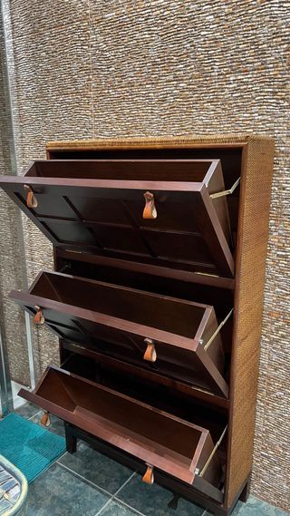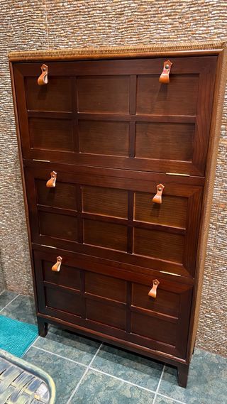 Mueble zapatero de diseño elegante. - Estructura principal de madera oscura. - Tres niveles con compartimentos. - Tiradores decorativos de cuero en cada nivel.