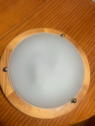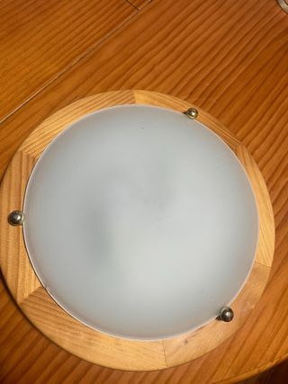 Lámpara de techo con un diseño moderno y elegante. - Base de madera. - Pantalla de cristal. - Detalles dorados.