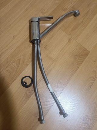 Grifo de cocina con acabado plateado. - Diseño moderno y funcional. - Fabricado en metal y plástico de alta calidad. - Incluye mangueras flexibles para su instalación.