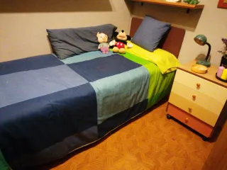 Dos camas individuales de 80 cm, de madera. Son perfectas para una habitación infantil o juvenil. Colchones de espuma y somier de muelles. Mesita noche a conjunto. Regalo sabanas, mantas y edredones a juego. - Medidas: 80 cm de ancho. - Material:madera. - Color marrón.