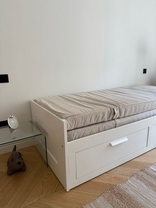 Esta cama es perfecta para aprovechar el espacio, sirviendo como sofá de día y cama de noche. En los 2 amplios cajones tendrás mucho espacio para guardar edredones, almohadas y ropa de cama. Una solución muy práctica para espacios reducidos. Este diván debe combinarse con dos colchones de 80x200 cm que se ponen uno encima del otro cuando el diván se usa a modo de cama individual, y uno al lado del otro cuando se usa como cama doble. Tiene una madera rota pero llevamos 3 años usándola sin ningún tipo de problema.