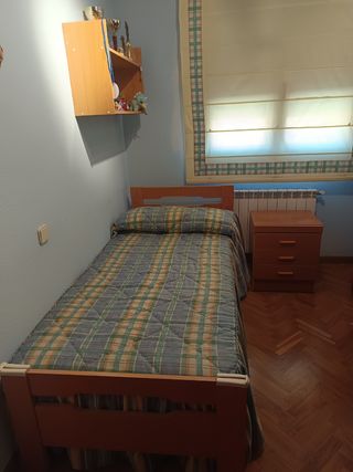 Se vende dormitorio juvenil en buen estado. - Cama individual de madera. - Mesita de noche con tres cajones. - Estantería de pared de madera. - Estantería de pie - Mesita Estudio - Se regala edredón de cama a cuadros incluso stor e incluye colchón La cama es de 90x 1,80