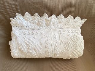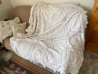 Colcha vintage en color blanco, con un diseño muy bonito adornado en todos sus bordes. Sus medidas son 2,20 metros de largo por 1,80 metros de ancho. Pesa 2.600 gramos Tan solo muestra 3 descosidos y una manchita inapreciable (ver últimas 3 fotos) Si te gusta la vendo por 100 euros porque no tengo espacio en casa, el precio es un regalo! Envío o entrego en mano en zona Aluche (Madrid) (ganchillo, crochet, hecha a mano, bordada, garbanzo, puntilla, encaje, clásico, ibicenco, antiguo, pie de cama, edredón, manta, tapete, mantel, cubre cama)