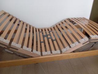 Base de cama articulada de madera de haya para mayor flexibilidad de las lamas, ideal para un descanso personalizado. Tiene una estructura fuerte y resistente, el motor es bastante silencioso. Toda ella es en madera clarita, incluso las patas. Tiene un diseño tan sencillo que se integra en cualquier dormitorio. Muy poco uso. También hay posibilidad de llevarla con el colchon de latex, las faldas de la cama que tapan las patas, el edredón y funda de almohada...130€. También vendo el cabecero verde...40€ Todo, como la última foto..400€. También tengo espejo y sillón tapizado a juego. Para ver y recoger en Gamonal, Burgos