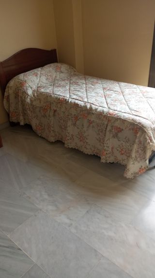 Vendo cabecero 90de cama y mesita de noche. Ambos en madera y decorados a mano.La mesilla lleva su cristal. Somier de låminas e incluye sus patas y se regala espejo en madera y un edredón de Reig Marti, color marfil.