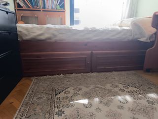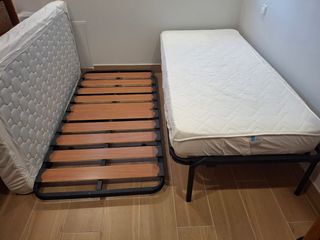 -Doble somier : principal y secundario (desplegable con ruedas) de 190×90. -2 colchones 190×90. El del somier principal con grosor de 18cm; el de la cama supletoria de 14 cm. -2Fundas de regalo. -1Colcha de doble cara de regalo. Todo en muy buen estado, prácticamente sin uso.