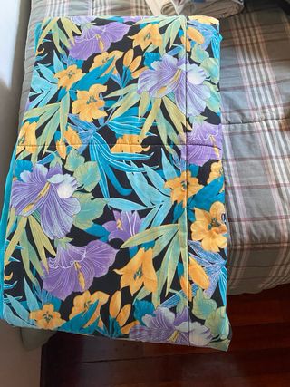 Edredón con un vibrante estampado floral. - Diseño con flores en tonos morados y turquesas. - Borde inferior en color turquesa. Para cama de 90 / 135 también sirve. Solo hasta el 23 de Septiembre.