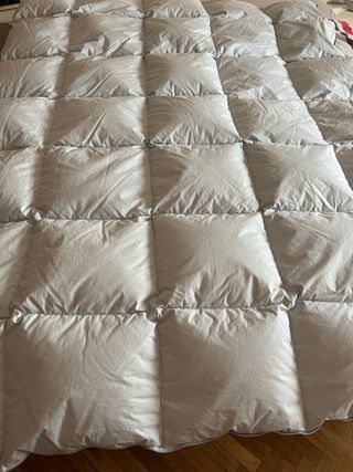 Edredón de plumón de oca europea para cama de 180cm. Marca: FERDOWN (Comprado en El Corte Inglés). - Relleno de alta calidad. - Tacto suave y confortable. - Diseño acolchado para una distribución uniforme del calor. Tamaño estándar: 260x240cm Recién lavado en tintorería con tratamiento higienizante y anti-ácaros. Sin usar desde la tintorería. Lavado anualmente en tintorería. Usado solo 4 inviernos. Material: 90% Plumón Oca Europea. 10% pequeñas plumas. 180gr/m2. Nivel Térmico 3: Máximo calor, para gente muy friolera o casas frías. Entrego en mano en barrio VALDEBEBAS (Madrid ciudad zona Norte). Mira mis 200 opiniones 5*