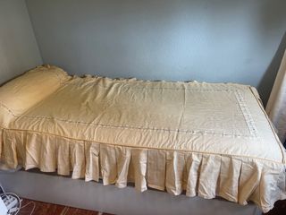 Sabana bajera + Funda de almohada + Funda de edredón Para cama de 90 Apenas uso Tiene una pequeña mancha en la esquina de la funda de edredón, casi no se nota