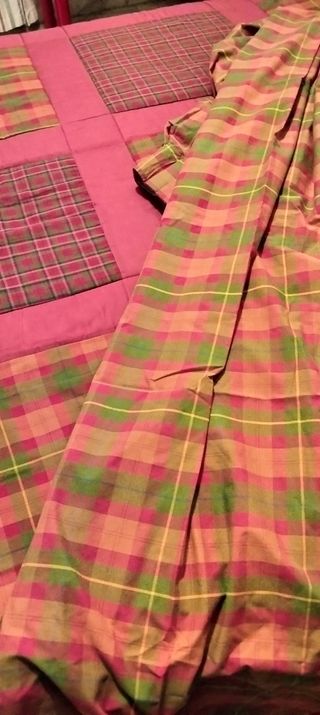Precioso juego para vestir dormitorio individual. Consta de funda para canapé de 90cm con volante en cuadritos pequeños de vichy. Colcha con cenefa y volante de tablas para cama de 90. Funda edredón de 2m por 1,38m. Funda Cojines de 28 por 28. Funda almohadón 73 cm por 45 cm. Cortinas a juego de dos para riel de 0,97m por 2,64m. Regalo de faldón recto a modo galería de 0,43 por 2,20m y cojín en forma caramelo a juego. El tejido es de calidad en tonos crudos, rayas y cuadros de vichy combinados. Le falta plancha.