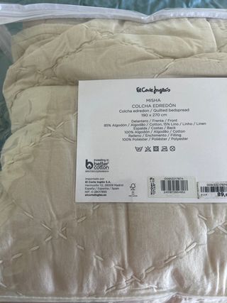 Preciosa colcha edredón de El Corte Inglés, en color beige. Es de tamaño cama 90. TENGO 2 - Confeccionada con materiales de primera calidad: 85% algodón y 15% lino. - Relleno de poliéster para mayor confort. - Diseño elegante y sencillo con pespuntes decorativos.