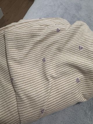 Edredón de plumas reversible en color gris y morado. Está en buen estado, aunque presenta algunas marcas de uso. - Medidas: Cama de 135 cm - Relleno de plumas 100% pato - Diseño acolchado