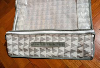 * Organizador de Almacenamiento Plegable * Cierre de Cremallera con 2 Tiradores para facilitar su apertura * 2 Asas Laterales para facilitar su manejo * Diseñada para Almacenar y Organizar ropa de cama, ropa personal u otros artículos del hogar * Parte Frontal Transparente, que permite ver el contenido sin necesidad de abrirlo * Plegable, lo que facilita su almacenamiento cuando no está en uso * Ideal para Optimizar el Espacio en Armarios, Estanterías o debajo de la Cama * Diseño triangular en tonos grises y blancos en la base y laterales * Medidas : 77 cm Largo, 42,5 cm Ancho, 14,5 cm Fondo