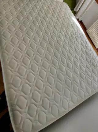 Base de cama metálica con somier de láminas de madera. - Estructura de metal resistente. - Láminas de madera para el soporte del colchón. - Medidas del somier: 190x150 cm. - 20cm de espesor. Patas altas de 30cm que dan buen espacio para guardar cajas debajo. El colchón es de muelles y soporta peso perfectamente. Es muy bueno . Tapizado muy bueno. De regalo va el nórdico ikea de la foto que es el edredon mas abrigado. Sabanas y funda almohada de regalo de algodón. Tambien otro edredón mas fino para verano. Los almohadones no van incluidos. Esta en un primer piso. Escaleras anchas y ascensor.