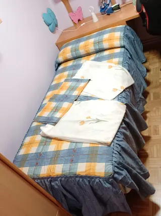 Se vende edredon de la marca "Plumatex" para cama de 0,90 cm. con diseño alegre en tonos azules y amarillos, bandó de 1,27 cm. de ancho x 0,35 cm. de alto y 2 cortinas de 1,76 cm. de ancho x 1,37 cm. de alto. Son de tejido suave y agradable al tacto. Perfecto para dar un toque de color a cualquier habitacion. Por favor, contactadme a traves de este chat.