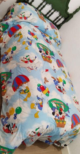 Edredón infantil con un divertido estampado de personajes de Disney volando por el cielo. Ideal para camas de 90cm. - Diseño multicolor con nubes y globos. - Personajes como Mickey, Minnie, Donald y Goofy. - Apto para lavadora.tengo dos,los dos 40€