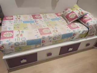 Se vende cama individual de 90cm, lista para usar, con otro somier debajo. Cómoda y escritorio. Regalo colchón. Funda, edredón, almohada y colcha, dos estanterias y un corcho - Estructura de madera. - Colchón azul. - Ropa de cama rosa con diseño de rayas.