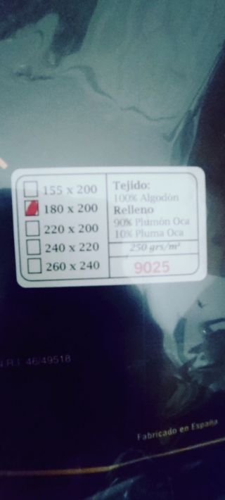 Edredón de pluma y plumón, nuevo a estrenar. Es de color blanco y está fabricado en España. - Medidas: 180 x 200 cm - Tejido: 100% algodón - Relleno: 90% plumón oca, 10% pluma oca - 250 grs/m²
