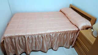 Colcha edredón en tono salmón , ideal para camas de 135 o 140 cm. Su diseño acolchado le da un toque elegante. - Acolchado con diseño de espiga. - Ribete decorativo en los bordes. - Falda con volante en la parte inferior. Mide de ancho 140 más volante y de largo 2,38 más volante El volante mide 49 cm
