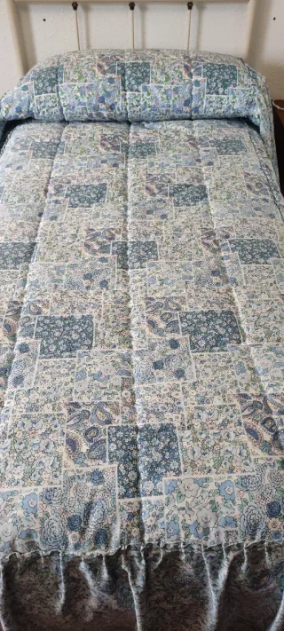 Conjunto de colcha edredón de la marca Reig Marti. Presenta un diseño patchwork con motivos florales y paisleys en tonos azules y multicolor. Precio por unidad. Cojin a juego con relleno por 5€ . Se pueden vender de forma individual - Diseño patchwork. - Estampado floral y paisley.