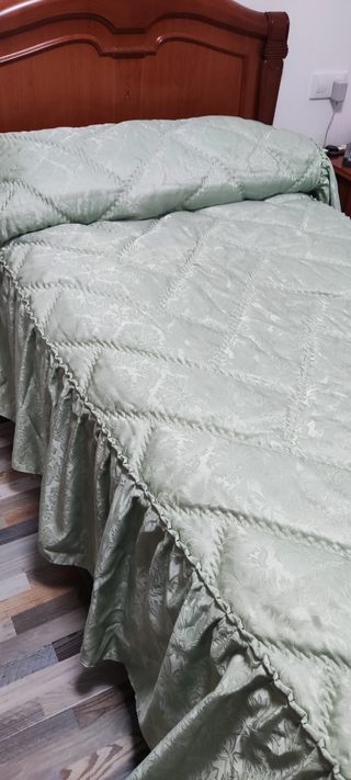 Colcha edredón de la marca Reig Martí para cama de 105 cm. Con un bonito diseño acolchado y un elegante volante. - Color verde. - Tejido con estampado floral. - Volante con acabado fruncido.