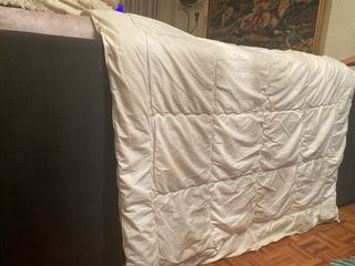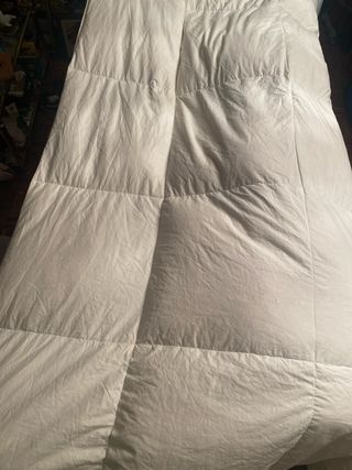 Edredón de plumas suave y confortable. Tiene manchas persistentes pero está li.pio y no pierde plumas. Se ha usado en jna cama de 190 por 110. - Color blanco. - Material de poliéster y tela.