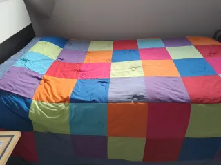 Colcha Para cama de 80. Largo de estremos cerrados ajustado es de 190. Para cama se 80 x 180 o 190. Acolchado, calentito Ajustable a la cama. Tiene unas cremalleras en la parte de arriba para ajustar como funda de la cama y abiertas como edredon. Muy buen estado De cuadros verde amarillo mostaza.